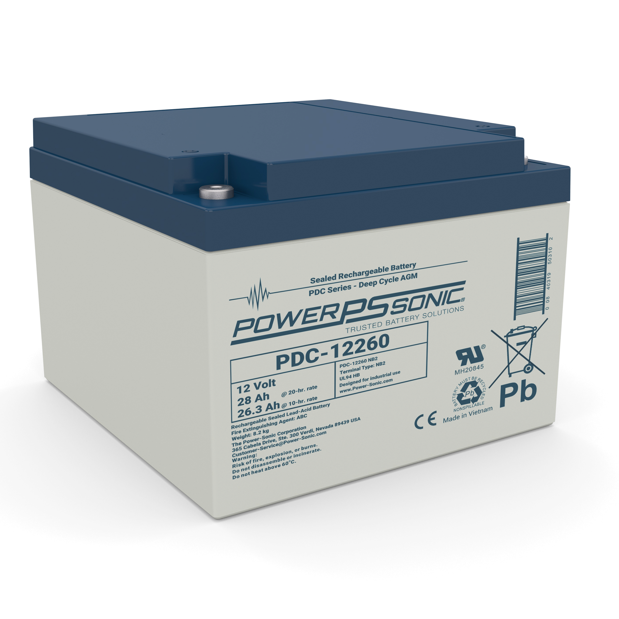 The PDC-12260 is part of our Deep Cycle AGM range. This 12.0V and 28.0Ah battery features long cycle life and deep discharge capability. Key advantages include AGM Technology, Deep Cycle Paste, Power Volume Ratio, SLA ABS Case, and SLA Maintenance Free and suitability for Golf Carts, Medical, Mobility, Solar, and Wind. Backed by decades of expertise, Power-Sonic batteries are subject to stringent quality controls through each step of the manufacturing process to ensure compliance, performance consistency, and reliability.