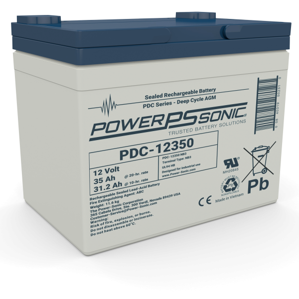 The PDC-12350 is part of our Deep Cycle AGM range. This 12.0V and 31.2Ah battery features long cycle life and deep discharge capability. Key advantages include AGM Technology, Deep Cycle Paste, Power Volume Ratio, SLA ABS Case, and SLA Maintenance Free and suitability for Golf Carts, Medical, Mobility, Solar, and Wind. Backed by decades of expertise, Power-Sonic batteries are subject to stringent quality controls through each step of the manufacturing process to ensure compliance, performance consistency, and reliability.