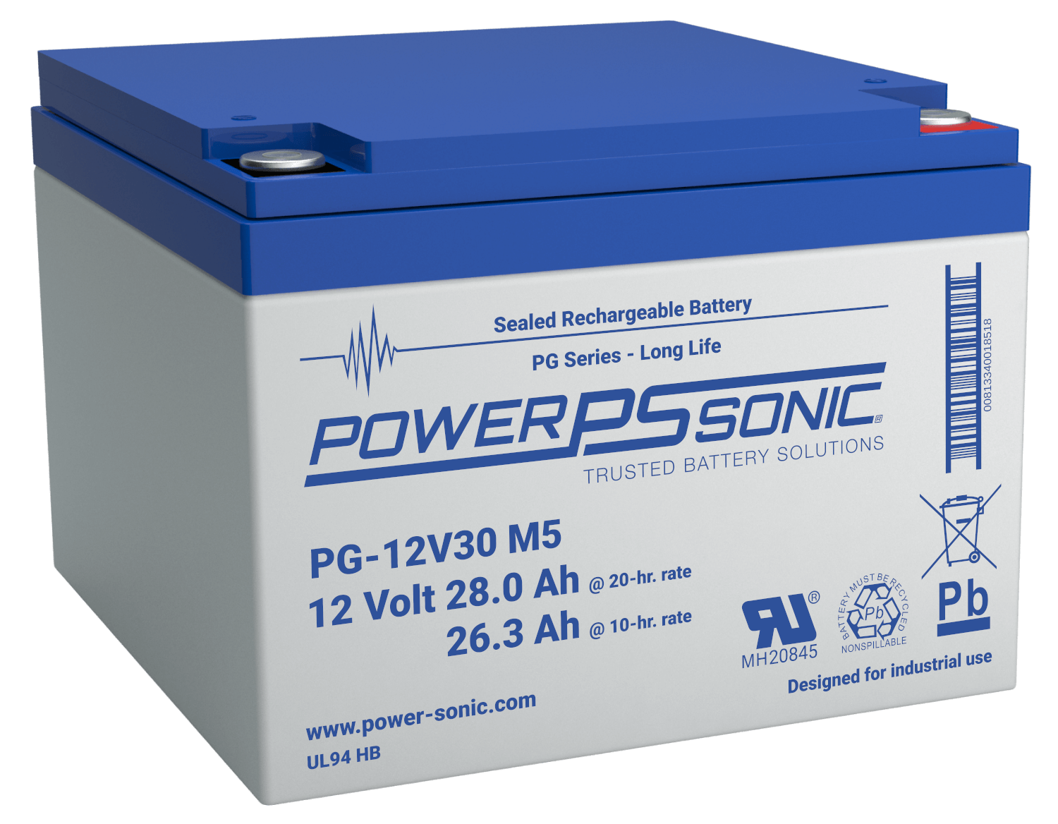 The PG-12V30 is part of our Long Life AGM range. This 12.0V and 28.0Ah battery provides long cycle life and deep discharge capability. Features include AGM Technology, SLA ABS Case, SLA Maintenance Free, and Thick Plate 10-12yr Design Life. These batteries are commonly used in Emergency Lighting, Fire Security, Solar, Telecomm, UPS, Utility, and Wind requiring extended service life and dependable standby power. Backed by decades of expertise, Power-Sonic batteries are subject to stringent quality controls through each step of the manufacturing process to ensure compliance, performance consistency, and reliability.