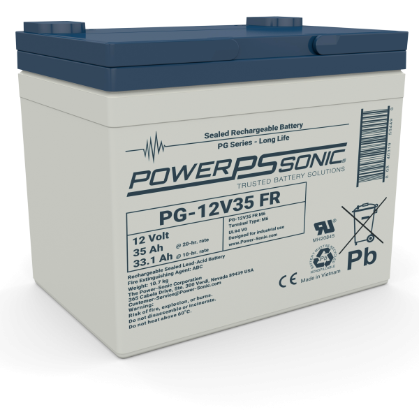 The PG-12V35 FR is part of our Long Life AGM range. This 12.0V and 33.1Ah battery provides long cycle life and deep discharge capability. Features include AGM Technology, SLA ABS Case, SLA Maintenance Free, and Thick Plate 10-12yr Design Life. These batteries are commonly used in Emergency Lighting, Fire Security, Solar, Telecomm, UPS, Utility, and Wind requiring extended service life and dependable standby power. Backed by decades of expertise, Power-Sonic batteries are subject to stringent quality controls through each step of the manufacturing process to ensure compliance, performance consistency, and reliability.