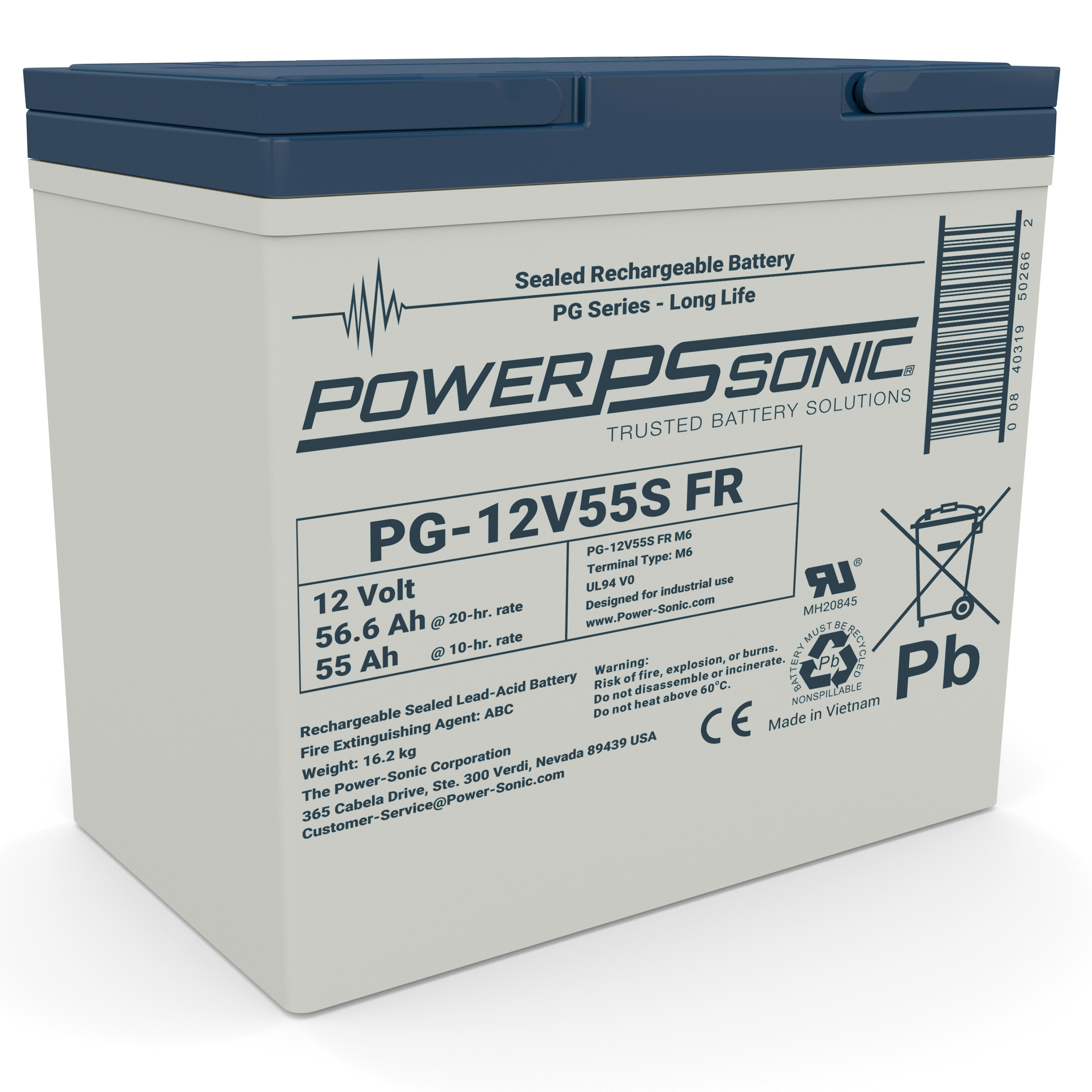 The PG-12V55S is part of our Long Life AGM range. This 12.0V and 56.6Ah battery provides long cycle life and deep discharge capability. Features include AGM Technology, SLA ABS Case, SLA Maintenance Free, and Thick Plate 10-12yr Design Life. These batteries are commonly used in Emergency Lighting, Fire Security, Solar, Telecomm, UPS, Utility, and Wind requiring extended service life and dependable standby power. Backed by decades of expertise, Power-Sonic batteries are subject to stringent quality controls through each step of the manufacturing process to ensure compliance, performance consistency, and reliability.