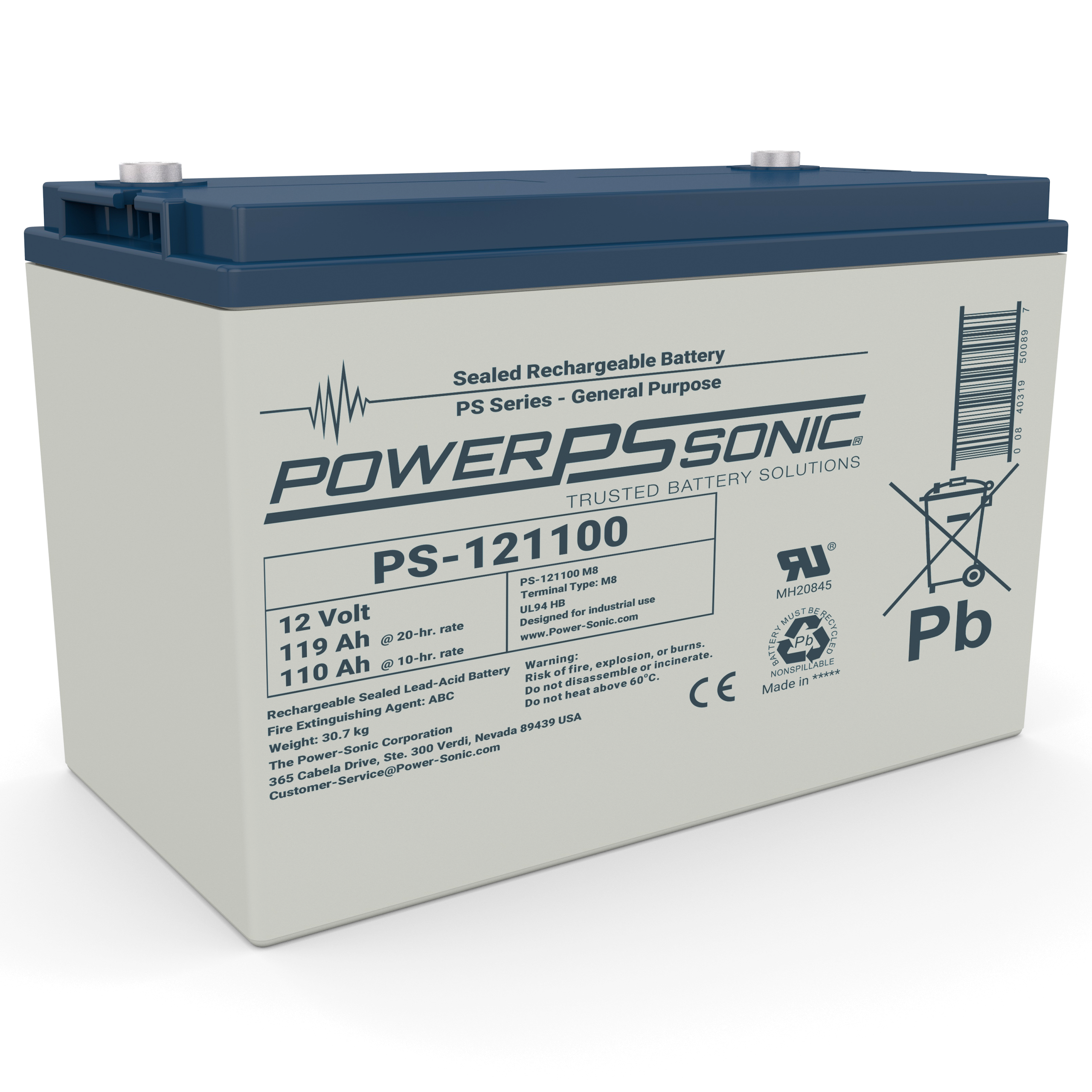 The PS-121100 is part of our General Purpose SLA range. This 12.0V and 110.0Ah battery provides dependable power for general purpose and standby uses. Features include AGM Technology, Gas Recombination, Power Volume Ratio, SLA ABS Case, and SLA Maintenance Free. These batteries are commonly used in Emergency Lighting, Fire Security, General Purpose, Medical, Signaling (Air,Rail,Sea), Solar, Telecomm, UPS, Utility, and Wind requiring reliable, light cyclic backup power. Backed by decades of expertise, Power-Sonic batteries are subject to stringent quality controls through each step of the manufacturing process to ensure compliance, performance consistency, and reliability.