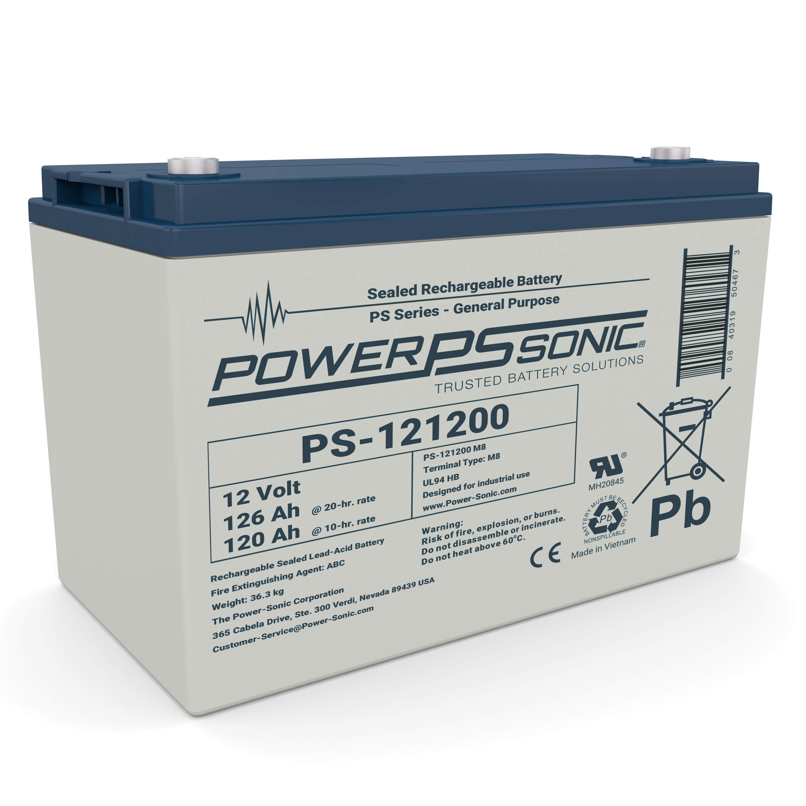 The PS-121200 is part of our General Purpose SLA range. This 12.0V and 126.0Ah battery provides dependable power for general purpose and standby uses. Features include AGM Technology, Gas Recombination, Power Volume Ratio, SLA ABS Case, and SLA Maintenance Free. These batteries are commonly used in Emergency Lighting, Fire Security, General Purpose, Medical, Signaling (Air,Rail,Sea), Solar, Telecomm, UPS, Utility, and Wind requiring reliable, light cyclic backup power. Backed by decades of expertise, Power-Sonic batteries are subject to stringent quality controls through each step of the manufacturing process to ensure compliance, performance consistency, and reliability.