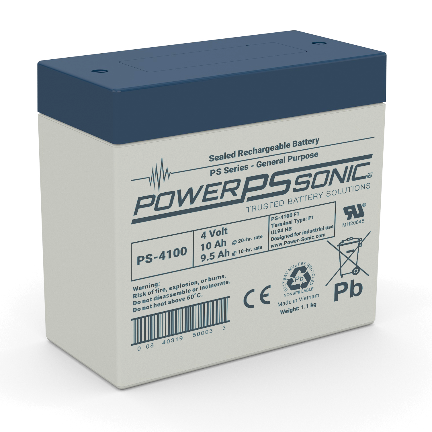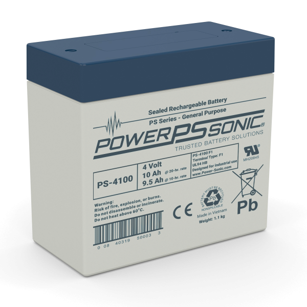 The PS-4100 is part of our General Purpose SLA range. This 4.0V and 9.46Ah battery provides dependable power for general purpose and standby uses. Features include AGM Technology, Gas Recombination, Power Volume Ratio, SLA ABS Case, and SLA Maintenance Free. These batteries are commonly used in Emergency Lighting, Fire Security, General Purpose, Medical, Signaling (Air,Rail,Sea), Solar, Telecomm, UPS, Utility, and Wind requiring reliable, light cyclic backup power. Backed by decades of expertise, Power-Sonic batteries are subject to stringent quality controls through each step of the manufacturing process to ensure compliance, performance consistency, and reliability.